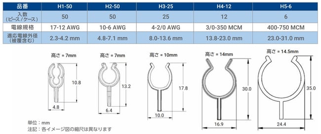 ・電線の外径に応じて5サイズをラインナップ。より詳細な仕様についてはカタ